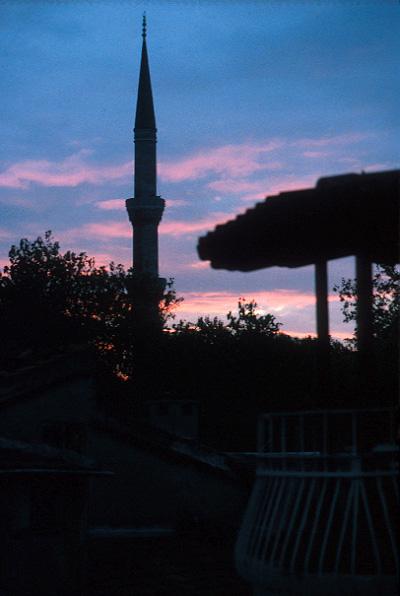 A minaret from the Blue Mosque at sunset, seen from the top of our hotel.